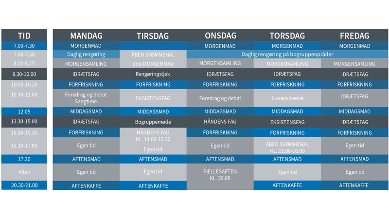Idrætsfagene varierer afhængigt af, hvornår på året du er på højskolen. Derfor skal du være opmærksom på, at dette kun er et eksempel på, hvordan det kan se ud!